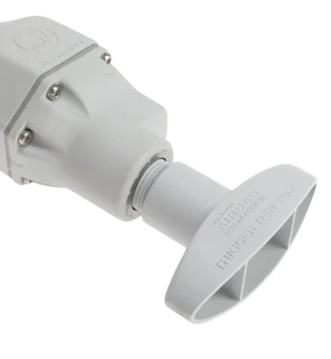 In a dangerous situation, the avalanche airbag must be deployed quickly and reliably. You can use the Airbag 3.0 Trigger Test Tool to deploy your airbag without using up a cartridge. The tool lets you familiarize yourself with the airbag system and practice deployment. Simply screw the tool all the way into the deployment mechanism, put on the backpack, and pull the deployment handle. A clear "snapping" sound indicates successful deployment.